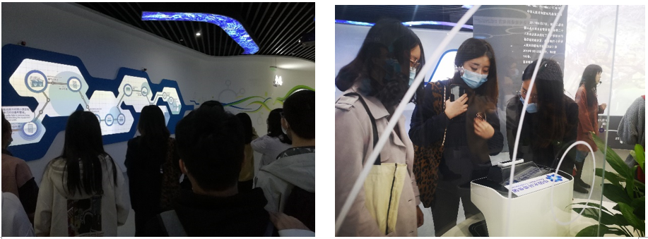 接下来,我们与工作人员进行了对接,由工程师李燕君带领大家进入到我们此次参观的第一站——水环境科普馆。这是一座科技感十足的展厅,运用了复合幻象、内投影、精准投影、镜面屏、雷达触控等科技手段进行展示。工作人员以水资源、水污染和水再生为主线,分生命之源、城市之殇、水之新生、生生不息、节水护水五个环节,认真细致地向大家进行了讲解,在展厅里面还有各种水质状况的实物展示,还可以用显微镜进行观察不同的水样,最后大家一起观看了一部制作精美、内容生动形象的小动画,生动地讲述了污水的回收、处理、再利用的过程。在科普馆里,通过工作人员的讲解,我们认识到了水环境治理及保护的重要性,从理论上了解了污水处理的工艺。
