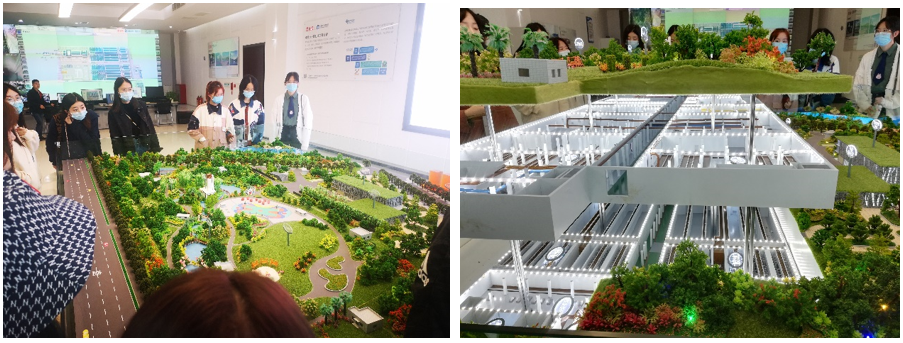 出了水环境科普馆,我们跟随工作人员的讲解,来到了整个再生水厂的核心工作区——中控室。在这里,有一个整个再生水厂园区的缩小后的三维立体模型。映入眼帘的是一个环境优美怡人的公园,有舒适的人行步道,茂密的绿地植被,还有各式各样五颜六色的健身设施。随着工作人员的深入讲解和对三维模型的操控,模型逐渐上升,我们终于明白了何为下沉式再生水厂。原来水处理的主要过程被安排在了地下两层,第一层的前半段先对污水进行的是简单的预处理,再对污水进行高效生化处理,在第二层则是对污水进行深度处理。来到中控室的智慧平台显示屏,我们了解到水厂的污水处理全部采取智能化控制管理,屏幕上有各个位置的设施的实时监控,还有出水口的监控和各项指标的监测数据,工作人员告诉我们“一般情况下,只需要两个工作人员在中控室进行操作和监控,就可以完成污水的处理工作。”在中控室,我们真正的感受到了智能化设备运用于环境保护领域的先进和优越,也大致了解了下沉式再生水厂的基本结构和污水处理流程。