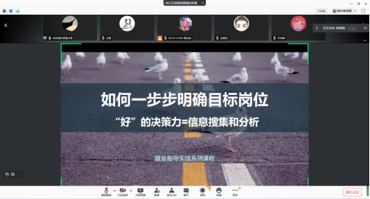 就业指导中心“女生职业成长训练营”系列活动第三期——“职业规划——如何一步步明确目标岗位”讲座在腾讯会议顺利举行。为积极响应学校防疫政策与要求,本次活动以线上会议的形式开展。活动由就业指导中心郑文娇老师主持,特邀杨都强老师主讲。