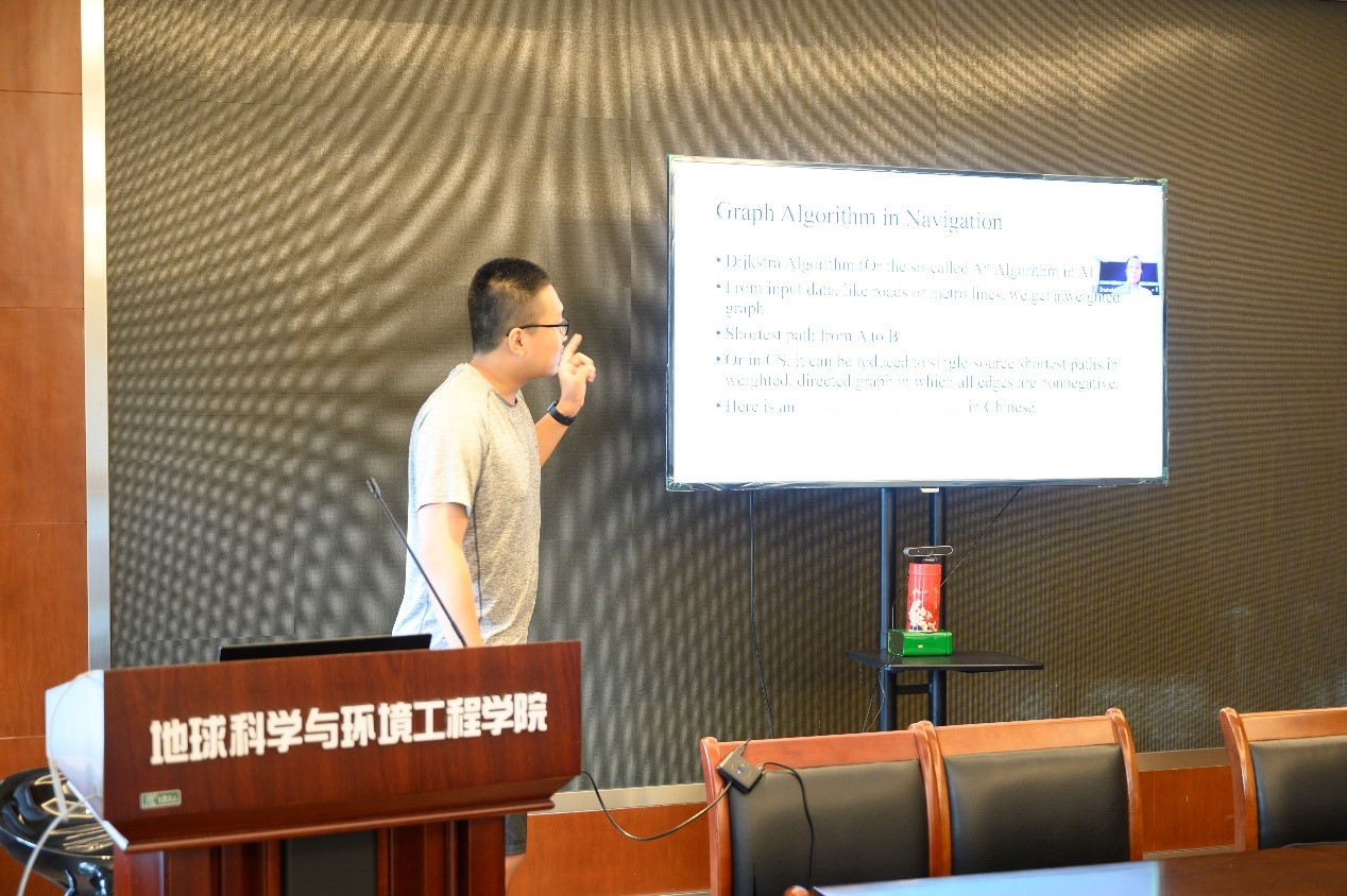 外籍院长Lutz Plümer教授作题为“What Geodesy and Geoinformation are all about – Route Planning – the basic Algorithm in your Navigation System”的讲授,现场通过交通出行如何进行路径规划的问题,与同学们进行讨论交流,气氛热烈。借由这项讨论,Plümer教授引出非常具有代表性的寻求最短路径的算法——Dijkstra算法,与同学们交流学习。