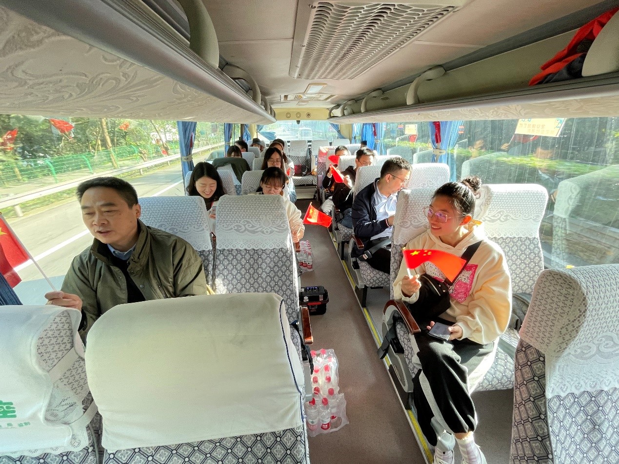 在前往邛崃的路途中,为提高大家的党史学习热情,由学院党委书记关秦川带领全体成员共同吟唱《唱支山歌给党听》《歌唱祖国》《我和我的祖国》等红色歌曲,伴随着嘹亮的歌声,大家向着纪念馆一路进发。