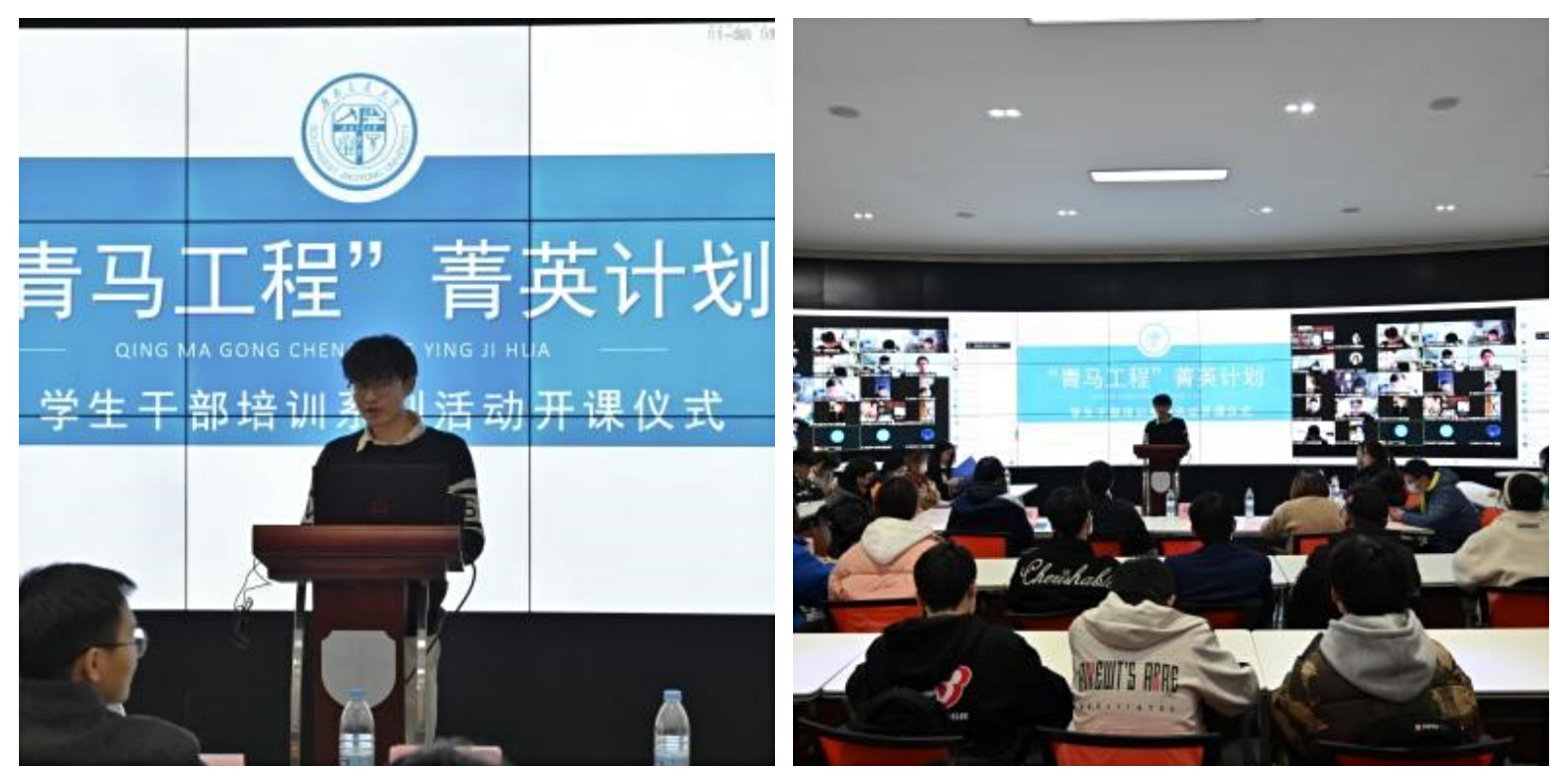 党委副书记傅尤刚,院团委书记杨都强、副书记崔宇龙、副书记李婧,学生园区与事务中心指导老师王琼,团建中心指导老师赵瑞涵参加活动。活动采用“线上+线下”结合方式举行,本21级全体学生干部于现场参加,本20级、研21级学生干部于线上以腾讯会议的方式参与活动。
