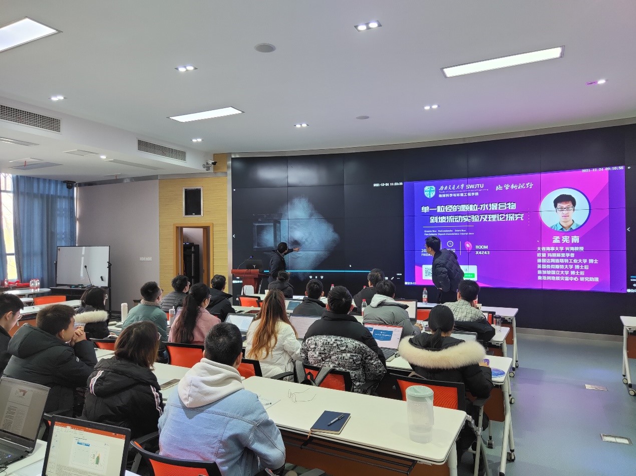 环境地球科学研究对象及研究领域具有很强的学科交叉性,为了促进学科蓬勃发展,打破不同领域技术和方法的界限,实现交叉学科理论融合与创新,2021年12月24日,我校地球科学与环境工程学院程谦恭教授邀请颗粒流、流体力学、计算流体力学、应用数学领域杰出青年学者,大连海事大学兴海教授、欧盟玛丽居里学者、德国达姆施塔特工业大学博士、英国曼彻斯特大学博士后、新加坡国立大学博士后及奥地利地质灾害中心研究助理孟宪南教授于我校X4243会议室开展了题为《单一粒径的颗粒-水混合物斜坡流动实验及理论研究》的学术报告。现场气氛热烈,学术氛围浓厚。