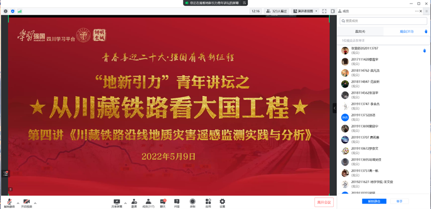 联合举办,我院承办的“青春献礼二十大·强国有我新征程‘地新引力’青年讲坛——从川藏铁路看大国工程”系列讲座,第四期《川藏铁路沿线地质灾害遥感监测实践与分析》如期在线上腾讯会议平台举行。本期讲座由影巢
