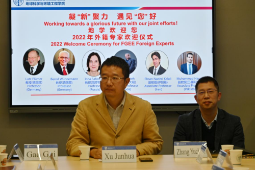 于X4548会议室举行“凝‘新’聚力 遇见‘您’好”2022年外籍专家欢迎仪式。国际处处长马磊、外专与引才引智办公室主任杨帆,影巢