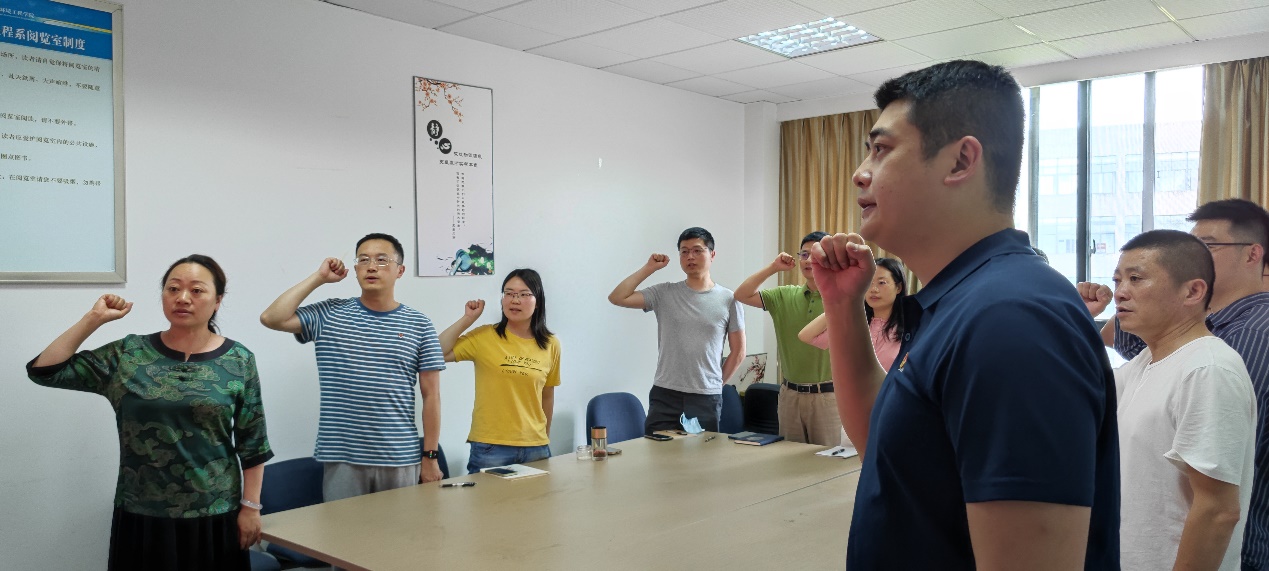 支部党员重温入党誓词。全体教师党员举起右手,握紧拳头,重温入党誓词。党员同志们回忆了自己的入党故事,讲述了入党初心,同时也表示要牢记共产党员的政治责任和历史使命,不断保持共产党员的先进性,以更加饱满的热情投身到教育工作中去,守初心、担使命、永向前,传承优良作风。