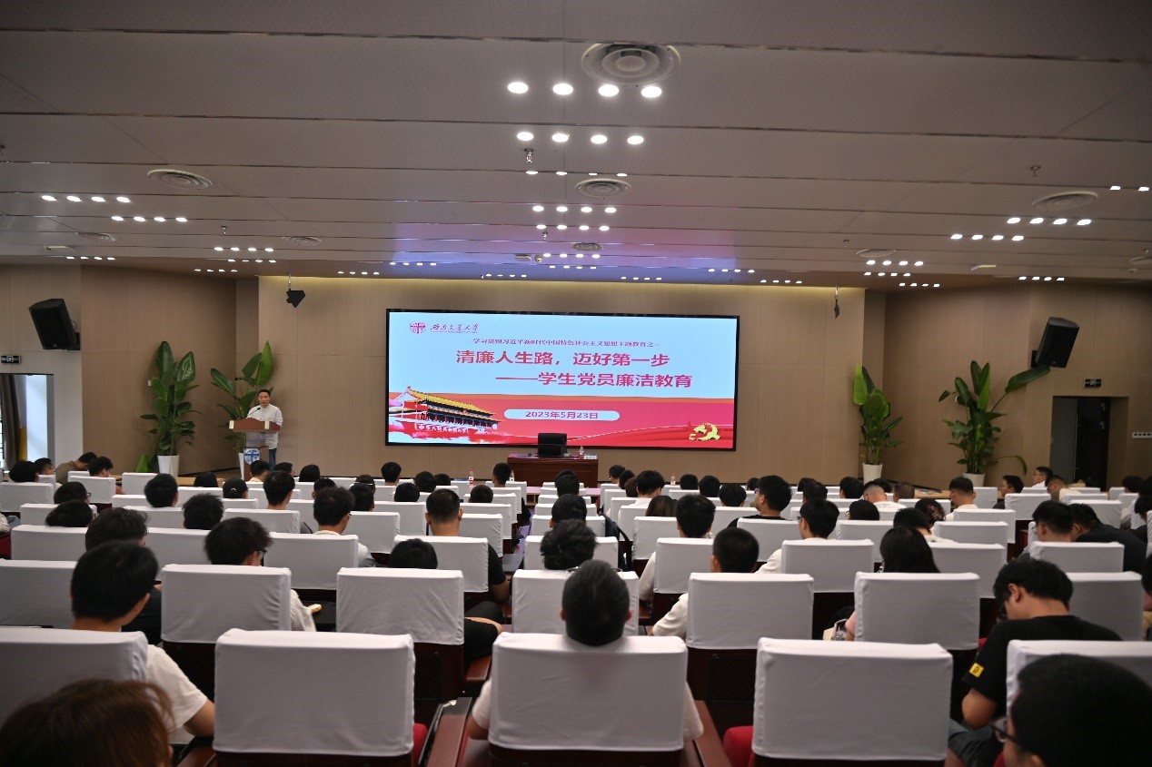 2023届毕业生党员讲授“清廉人生路,迈好第一步”专题党课。党课由学院党委书记关秦川主持,学院党委副书记、纪委书记郑波,毕业班辅导员和2023届毕业生党员、入党积极分子近200人参加了本次党课学习。