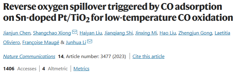 环境污染控制化学团队与清华大学李俊华教授团队合作,在Nature Communications上发表题为“Reverse Oxygen Spillover Triggered by CO Adsorption on Sn-doped Pt/TiO2 for Low-Temperature CO Oxidation”的高水平学术论文。Nature Communications是Nature出版集团旗下的一本综合性自然科学期刊,致力于发表高质量、原创性自然科学研究成果,涵盖了物理、化学、生物学、环境科学、材料科学、地球科学等领域。Nature Communications的2021-2022年影响因子为17.694。论文主要作者有:陈建军(清华大学,第一作者)、熊尚超(影巢