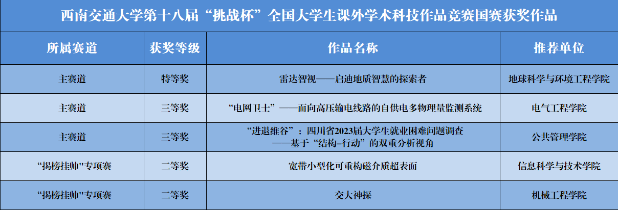 推荐的电气工程学院《电网卫士—面向高压输电线路的自供电多物理量检测系统》、公共管理学院《“进退维谷”:四川省2023届大学生就业困难问题调查—基于“结构—行动”的双重分析视角》2个项目均获得国赛主赛道三等奖,机械工程学院《交大神探》、信息科学与技术学院《宽带小型化可重构磁介质超表面》2个项目均获国赛“揭榜挂帅”专项赛二等奖。