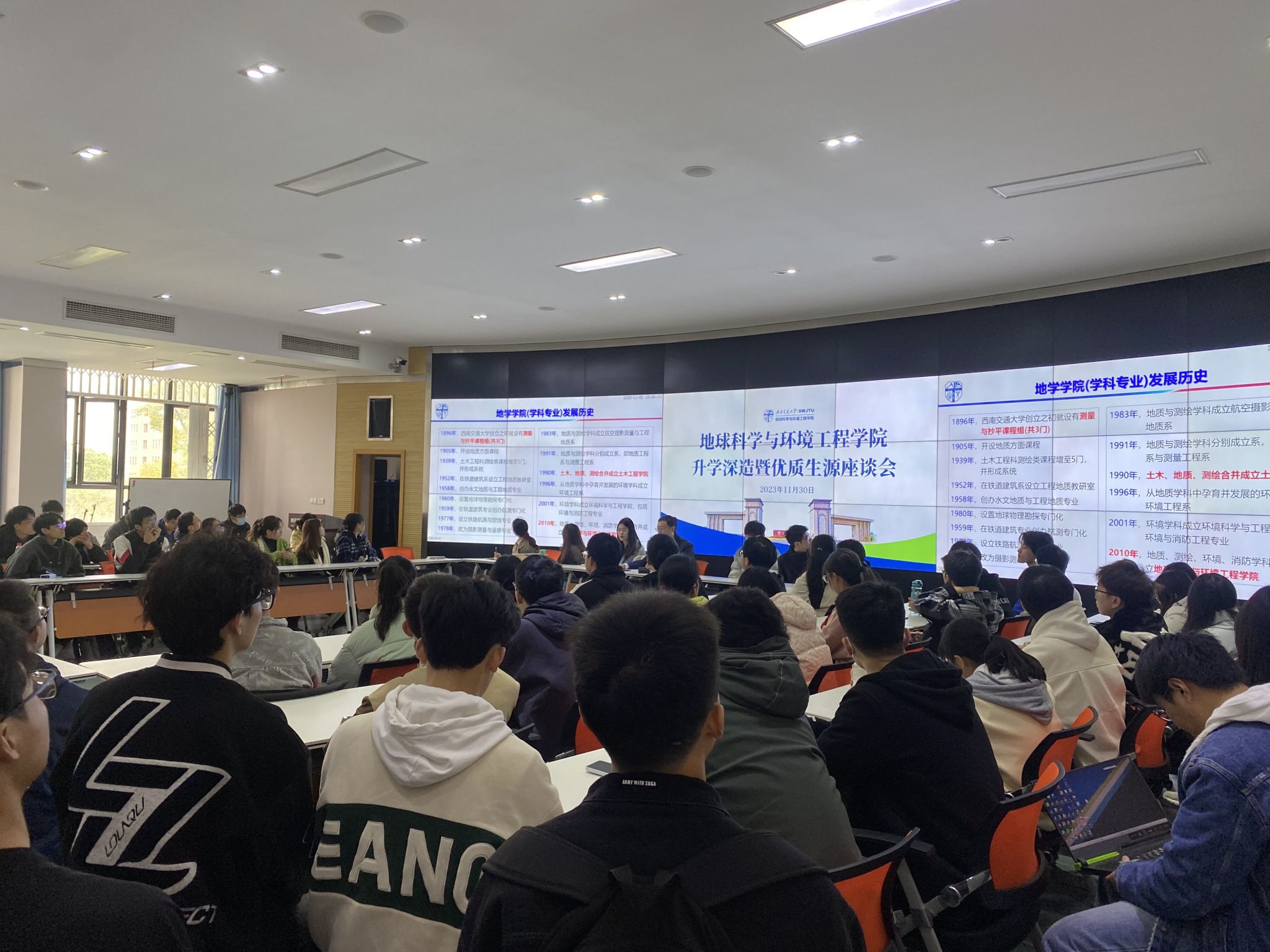 为了让同学们更加了解学院的情况,从而吸引更多的优秀本科生留在学院继续研究生学习,11月30日,地球科学与环境学院在X4243多功能报告厅开展升学深造暨优质生源座谈会。学院党委副书记郑波,辅导员王琼老师、梁爽老师,黄泳桦、彭俊岚与石奥博等三位优秀研一学生,以及院本科二年级、三年级同学参加。座谈会由负责学院升学工作的辅导员翟琦老师主持。
