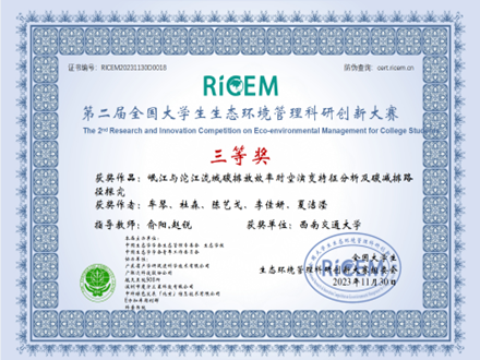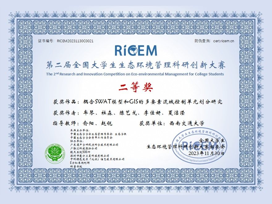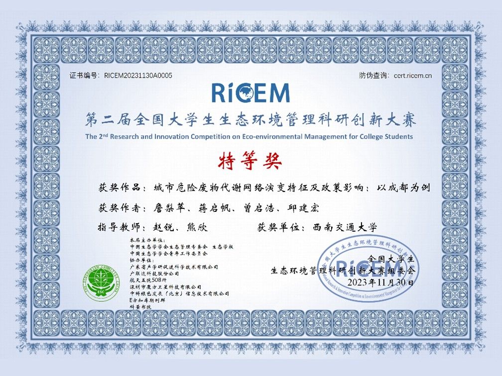 在我院环境科学与工程系赵锐、俞阳、熊欣三位老师的指导下,共有3项参赛作品获奖。其中,赵锐、熊欣老师所指导的参赛作品《城市危险废物代谢网络演变特征及政策影响:以成都为例》荣获大赛特等奖,团队成员为詹梨苹、蒋启帆、曾启浩、邱建宏;由俞阳、赵锐老师所指导的参赛作品《耦合SWAT模型和GlS的多要素流域控制单元划分研究》以及《岷江与沱江流域碳排放效率时空演变特征分析及碳减排路》分别荣获大赛二等奖、三等奖,团队成员为牟琴、杜森、陈艺戈、李佳妍、夏洁滢。