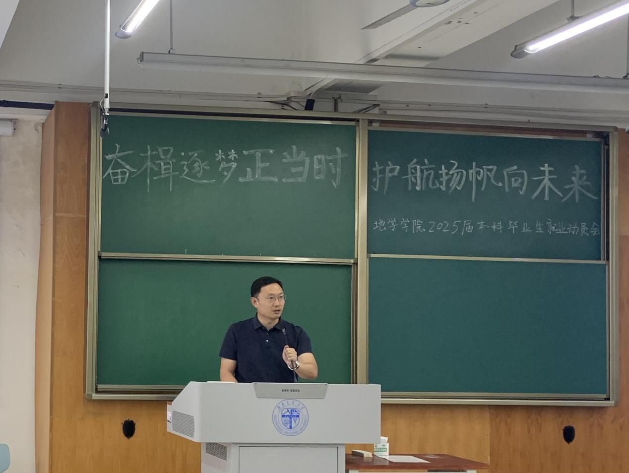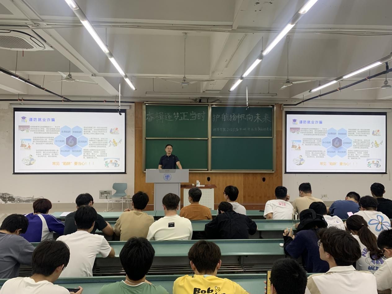 党委副书记郑波主讲,学院团委书记、就业工作负责人杨都强老师主持,本科2021级辅导员梁爽、王琼、胡佳慧、李林遥及学院2025届全体本科生参加。