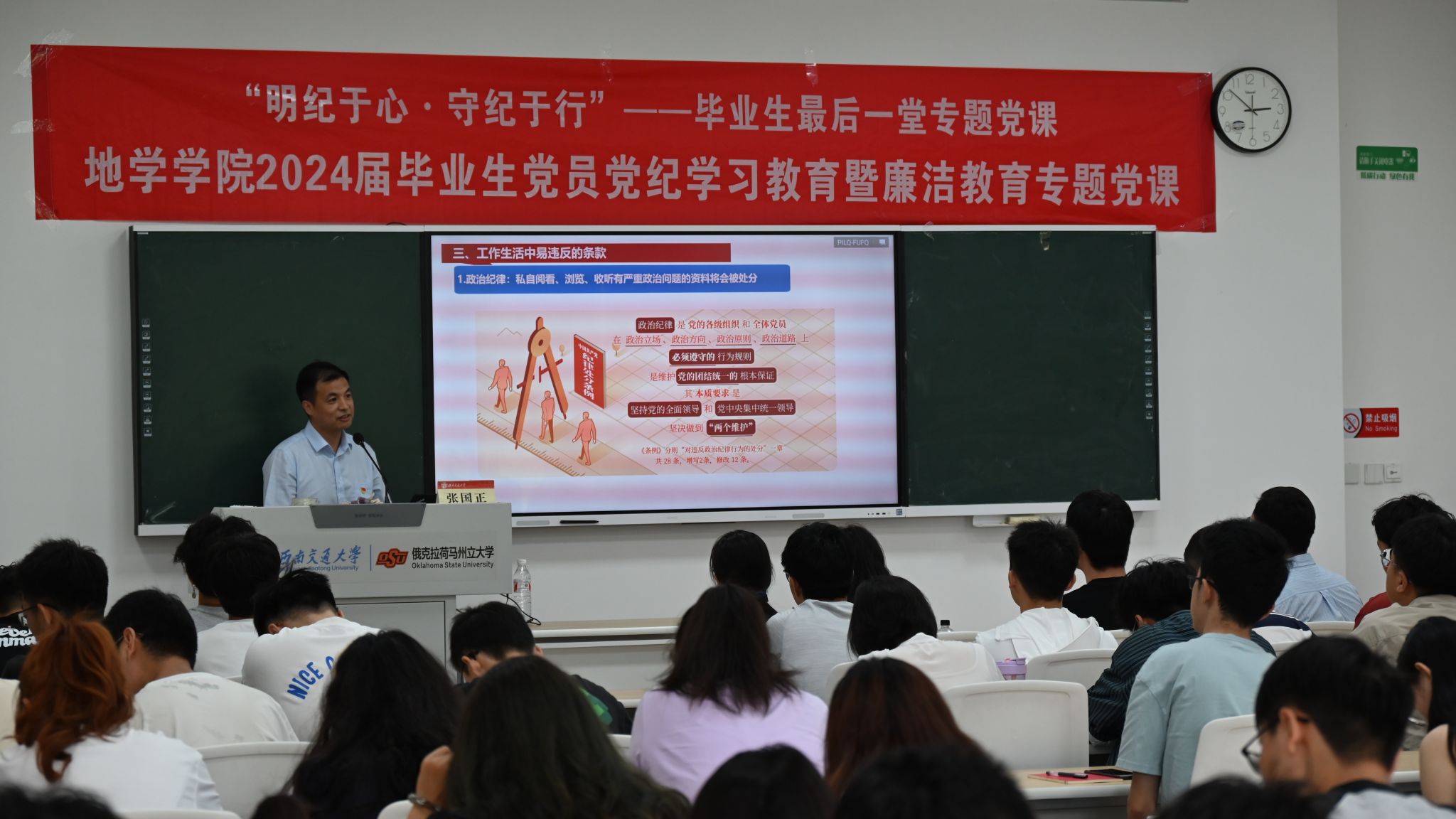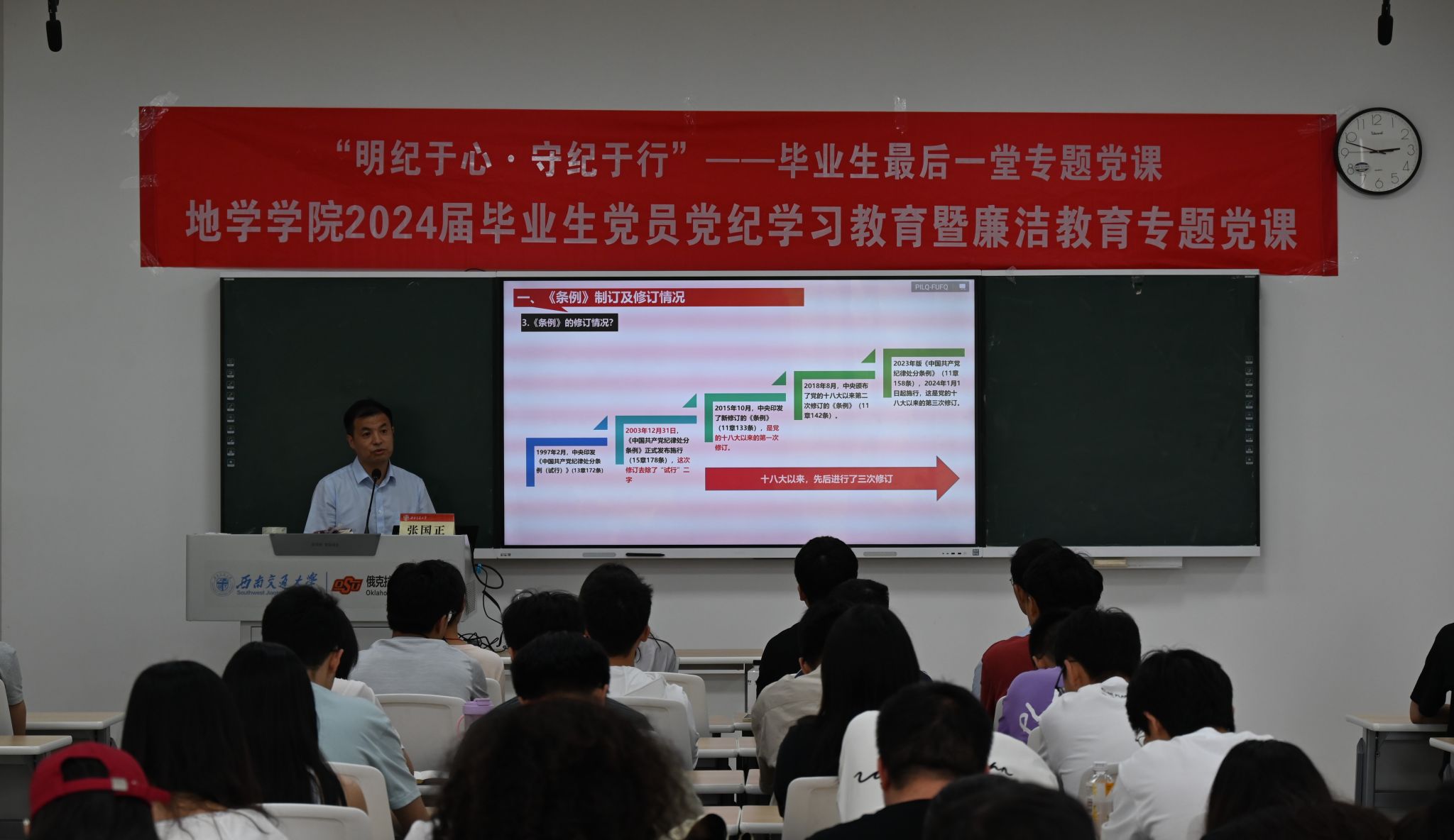 接着,张国正详细介绍了《条例》的基本情况。他强调,该条例是根据《中国共产党章程》制定的党内法规,要求党员必须严格遵守、深入学习,以明确底线要求,避免违纪行为。张书记带领全体毕业生党员回顾了《条例》的修订历程,从1997年发布的第一版到2023年的最新版,《条例》历经多次修订,这充分体现了党对纪律建设的高度重视。2023年版的《条例》不仅增强了政治属性,凸显了以人民为中心的根本立场,还体现了与时俱进的形势发展要求,并强化了监督问责和纪法衔接,为党员行为提供了更加明确的指导。