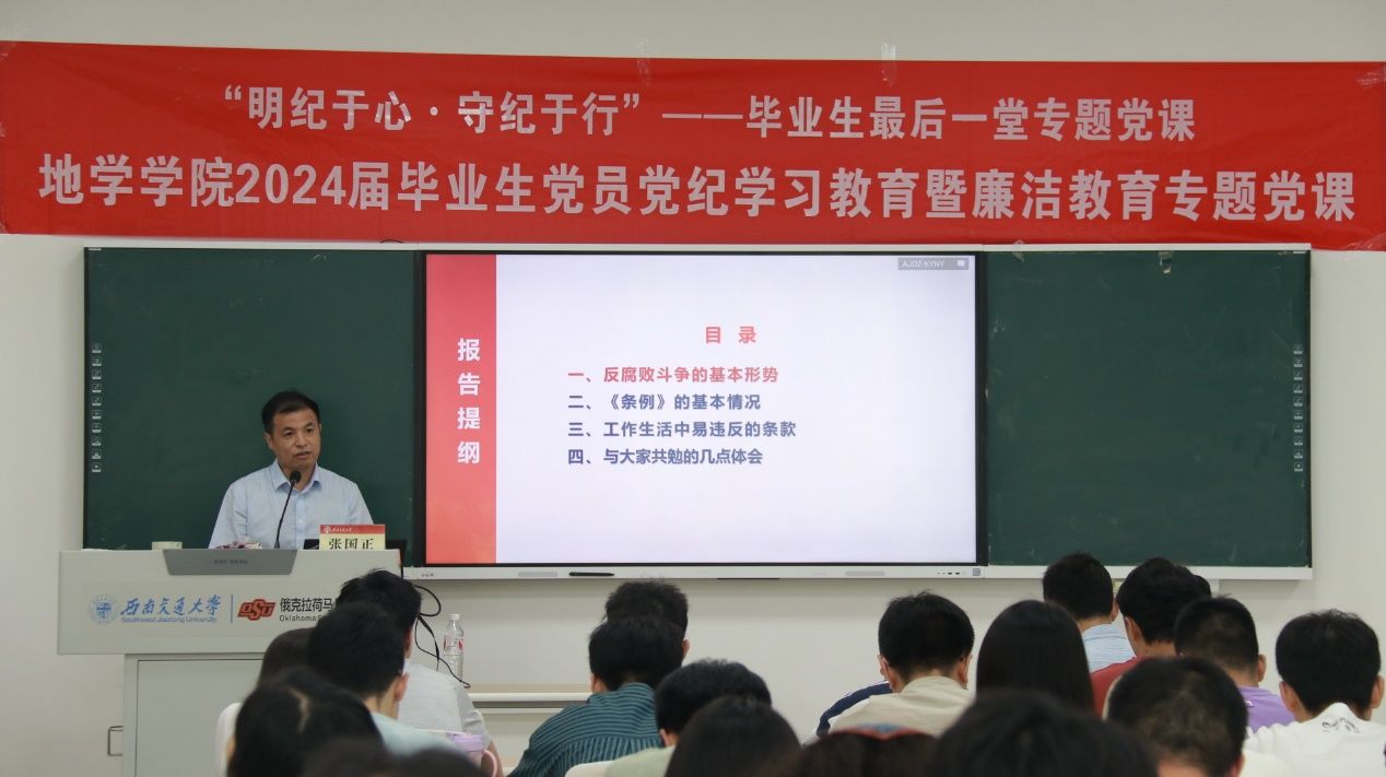 张国正以“清廉人生路 迈好第一步”为题,为毕业生党员上了一堂生动而深刻的党课。张书记首先通过2024年第一季度全国纪检监察机关的数据对当前反腐败斗争的基本形势进行了深入的分析。张书记指出,党的二十大报告已经明确指出反腐败斗争取得了压倒性胜利并全面巩固,但全党仍需牢记全面从严治党永远在路上,党的自我革命永远在路上。在这一背景下,加强党纪学习教育显得尤为重要。目前,全党正深入开展党纪学习教育,旨在解决部分党员对党的纪律规定不上心、不了解、不掌握的问题,要求党员们原原本本、逐章逐条学习《中国共产党纪律处分条例》,确保每位党员都能严格遵守党的纪律规定。
