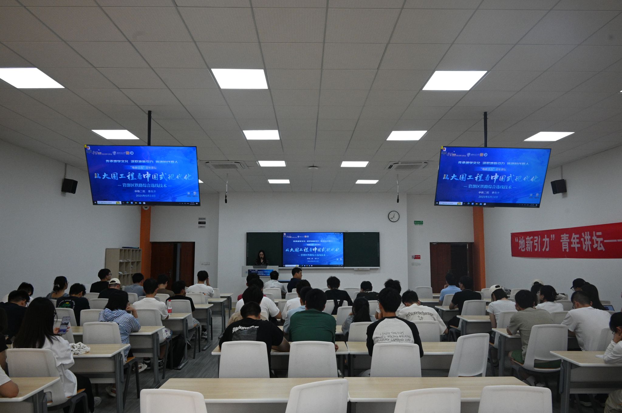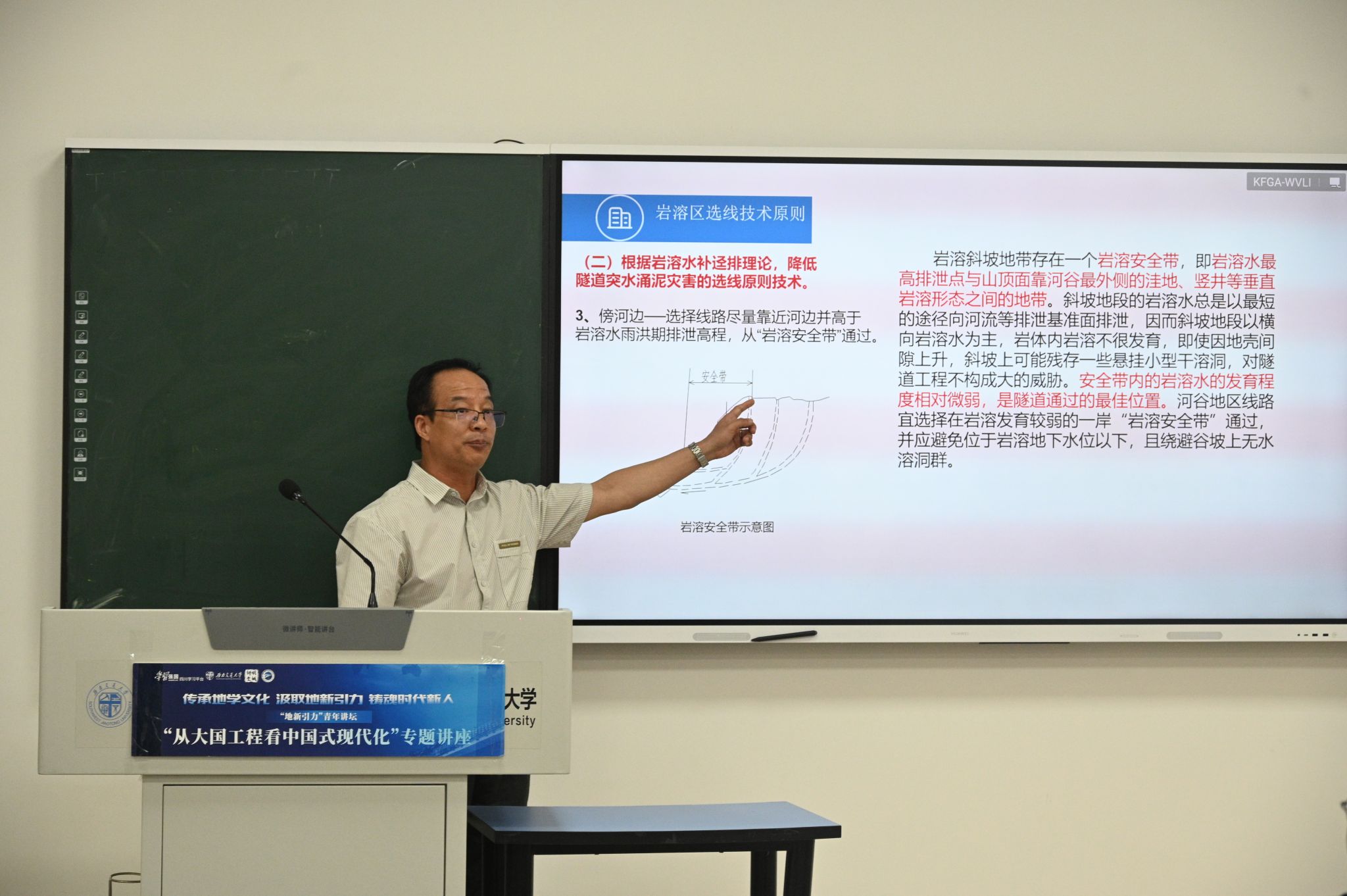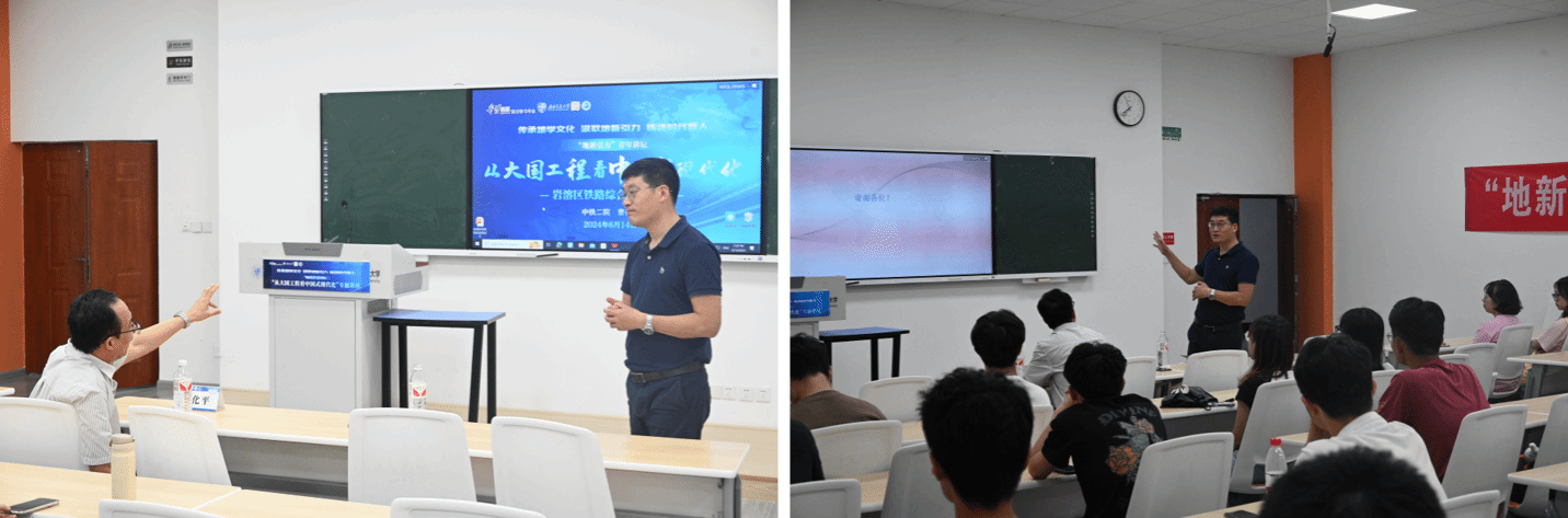 在四号教学楼X4247教室隆重举办了“从大国工程看中国式现代化”专题五讲座。本次讲座聚焦岩溶区铁路综合选线技术,邀请了业内知名专家中铁二院教授级高工曹化平作为主讲人,讲座由影巢