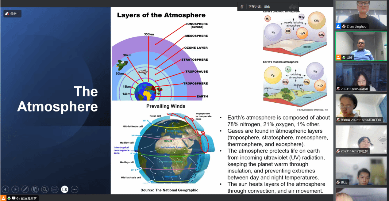Giri老师围绕岩石圈、大气圈、水圈和生物圈的形成过程和相互作用等内容展开,解释了板块运动和大陆漂移的概念,描述了大气层的各个层次及其功能,讨论了水圈的组成以及冰冻圈的各种形式,使同学们了解到地球上各个圈层与生物体的相互作用以及它们的重要性,最后讨论了影响气候和环境变化的外部和内部因素,呼吁大家警惕全球异常气候变化,保护环境。