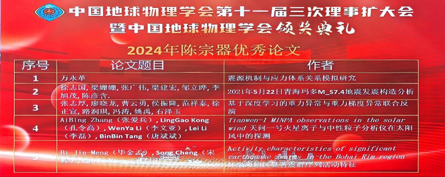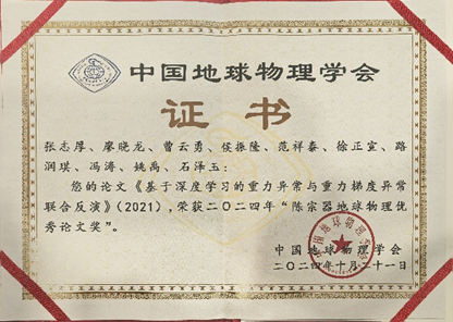 10月21日, 中国地球物理学会第十一届第三次理事扩大会暨中国地球物理学会颁奖典礼于福建厦门隆重举行。我院张志厚副教授及其团队于2021年在《地球物理学报》(2021年第64卷)发表的文章“基于深度学习的重力异常与重力梯度异常联合反演”荣获2024年度“陈宗器地球物理优秀论文奖”。