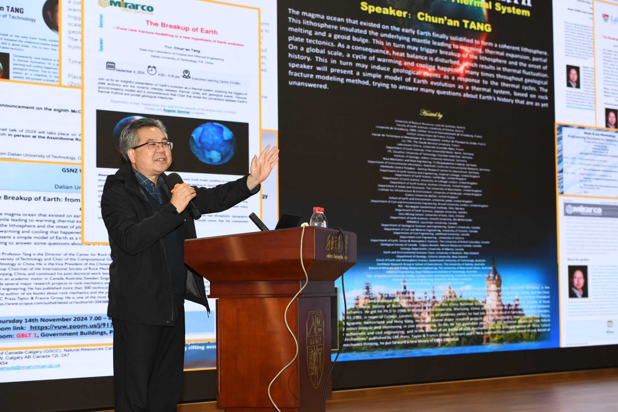 讲座中,唐春安教授基于热力学、物理学和力学的基本原理,从龟裂的形成机理入手,详细阐述了“地球大龟裂”理论。唐教授提到,该学说通过自主研发的地球模拟器2.0,模拟了岩石圈的破裂过程,揭示了板块起源的龟裂模式,特别是洋中脊裂谷的形成过程。他还通过建立地球系统的热平衡方程,解释了岩石圈破裂如何诱发地球冷-热波动的演化机制。