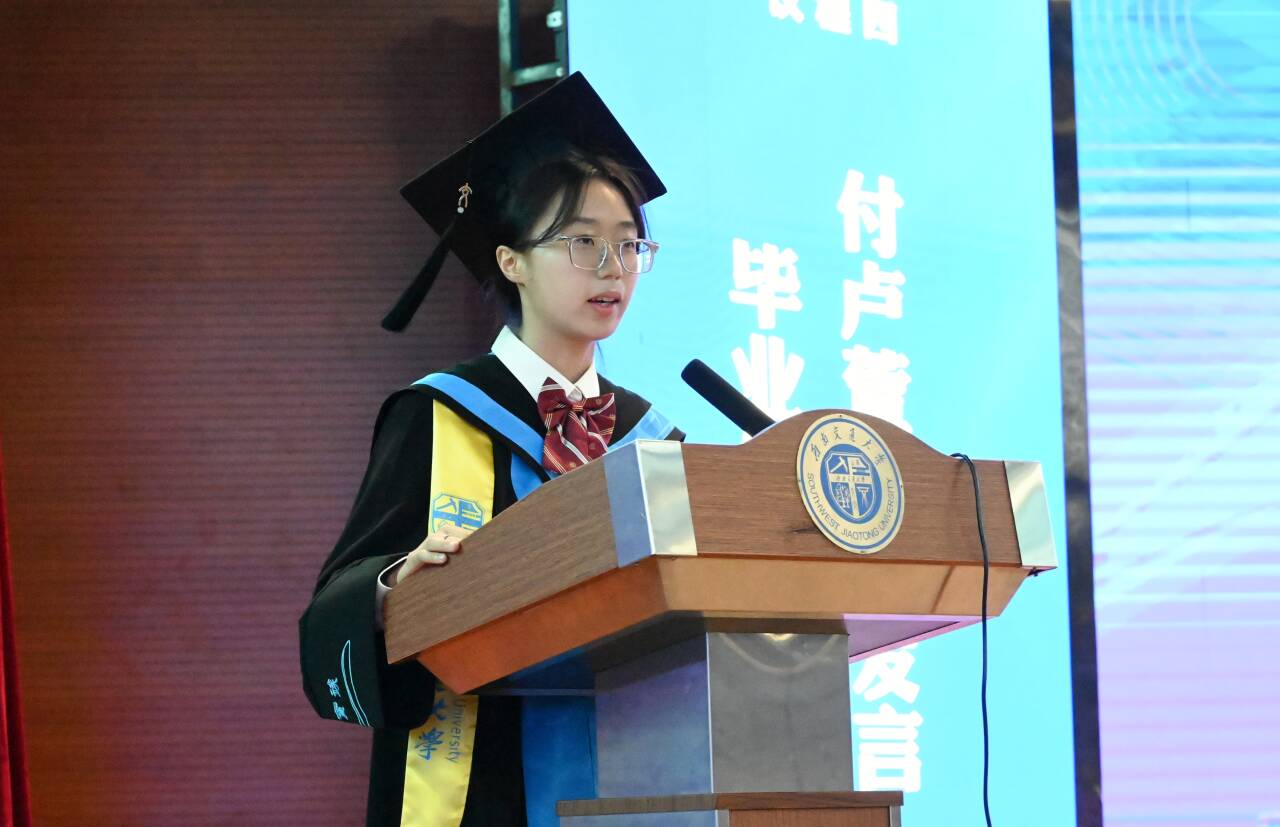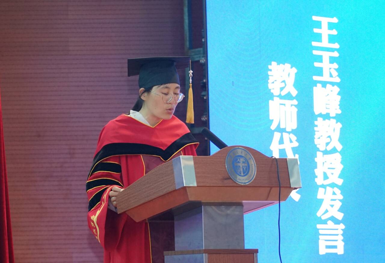 教师代表王玉峰发言。她结合自身求学、工作、科研的宝贵经历,勉励全体同学们“先学会做人,再学会做事”,时刻怀揣一颗虚心好学之心,在工作中积累知识、充实自我,不断完善自己的知识结构;鼓励同学们坚守梦想,在工作中以实践为牵引持续学习,在专业领域深耕细作,汲取跨学科知识、拓宽视野;叮嘱同学们始终保持一颗平常心,学会理解、学会感恩、学会担当,勇敢直面现实的艰辛与挫折。祝愿全体毕业生们自信勇敢、展翅高飞、砥砺前行。