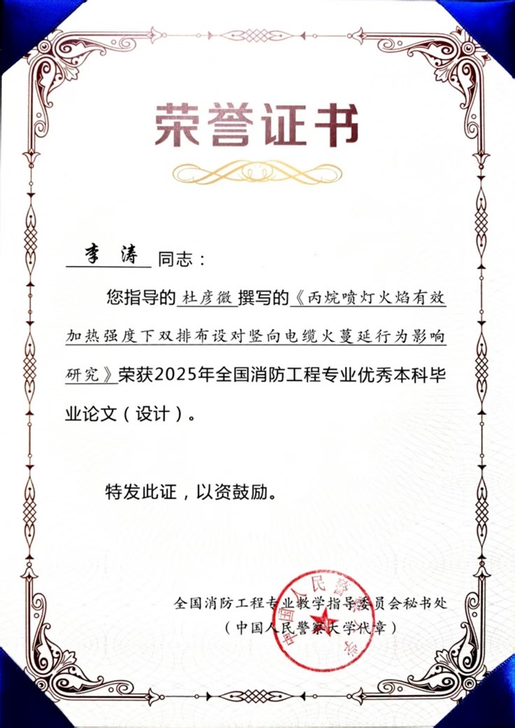 李涛老师指导的2025届本科生杜彦微撰写的《丙烷喷灯火焰有效加热强度下双排布设对竖向电缆火蔓延行为影响研究》荣获2025年全国消防工程专业优秀本科毕业论文(设计)。该论文聚焦竖向空间特殊场景中的前后双排竖直电缆燃烧问题,深入剖析双排布设条件下对火焰蔓延动力学特征的影响机制,为电气火灾蔓延控制提供理论依据。