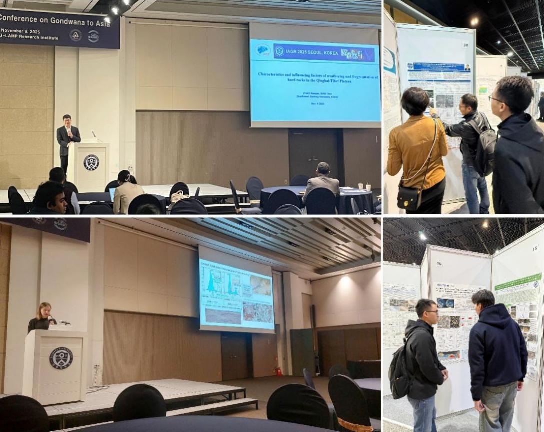 会议期间,赵晓彦教授作题为《Characteristics and influencing factors of weathering and fragmentation of hard rocks in the Qinghai-Tibet Plateau》口头报告,并主持了分会场学术报告。廖昕副教授展示题为《Chemical Weathering Effects on the Dynamic Mechanical Properties of Black Shale Slip-zone Under Acid Erosion Action》海报报告;Alina Perfilova博士后作题为《Reconstruction of magmatic protoliths of greywacke sandstones hosted by accretionary complexes》口头报告;任祥博士后展示题为《Silurian subducted oceanic crust-derived adakites in the southern East Kunlun Orogen: Implications for transition from Proto-Tethys to Paleo-Tethys realm》海报报告。报告人与国内外学者进行了深入而热烈的学术交流,向国际同行充分展现了各自最新的研究成果,同时对未来进一步深化学术交流和科研合作等方面进行了充分讨论。