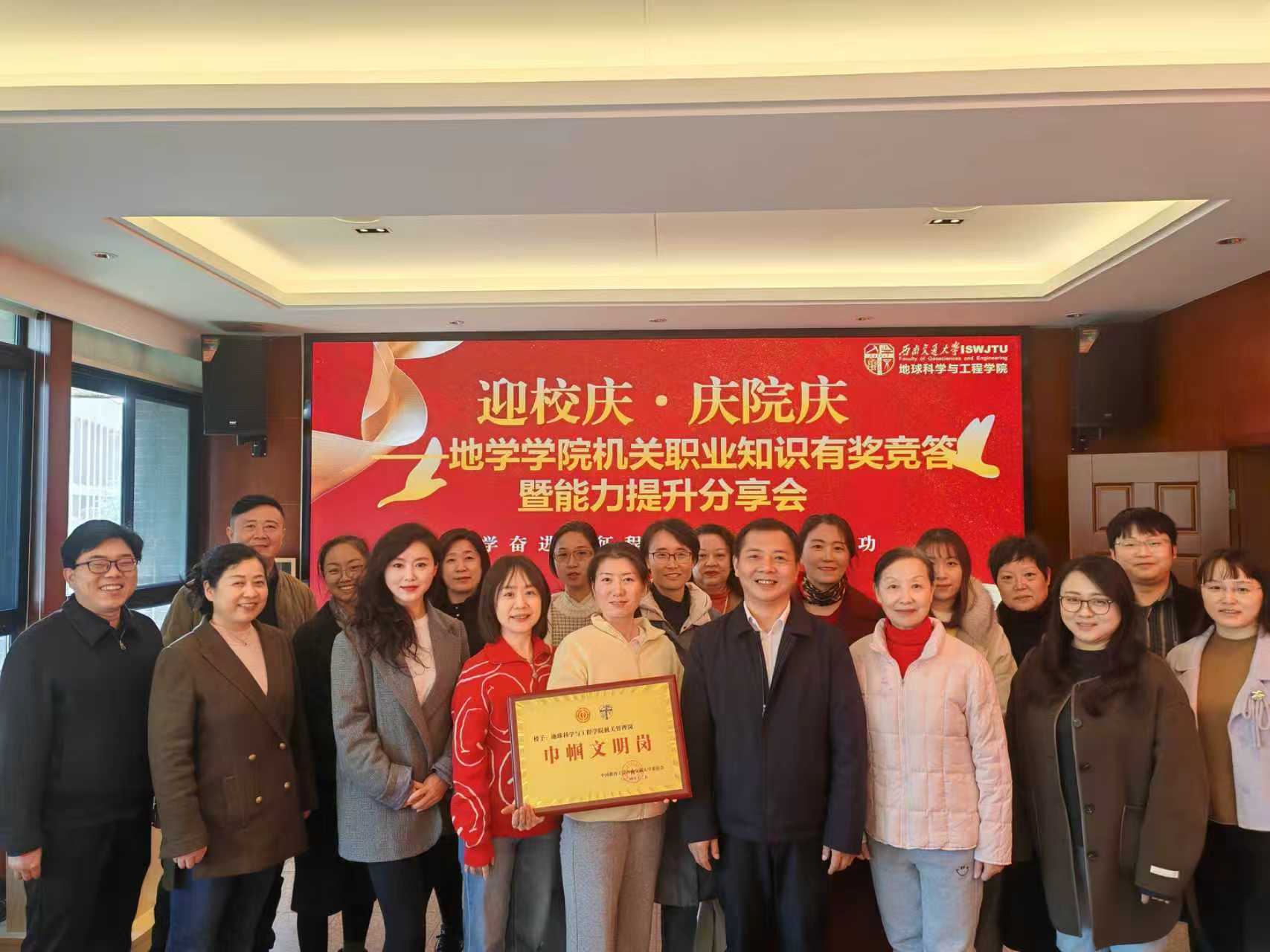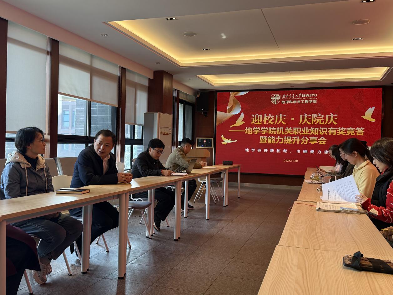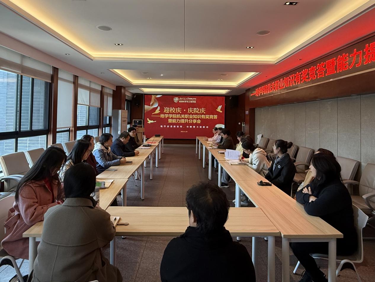 机关以“地学奋进新征程,巾帼聚力建新功”为主题,以学促干、以赛赋能,成功举办职业知识有奖竞答暨能力提升分享会。学院党委书记郑简平,校工会副主席王轶、校工会组织女工办公室陈秀梅,及学院机关全体职工参加活动。