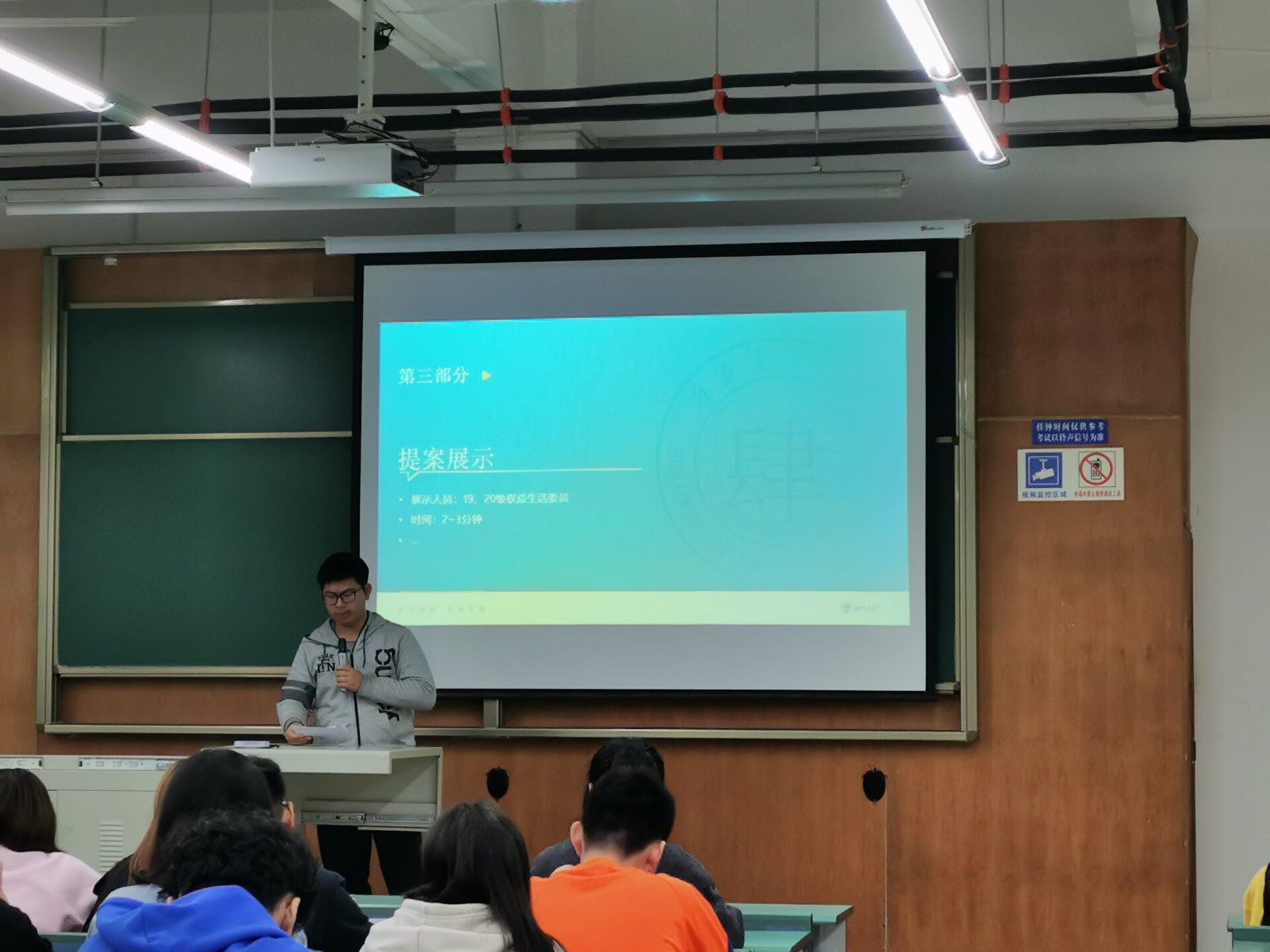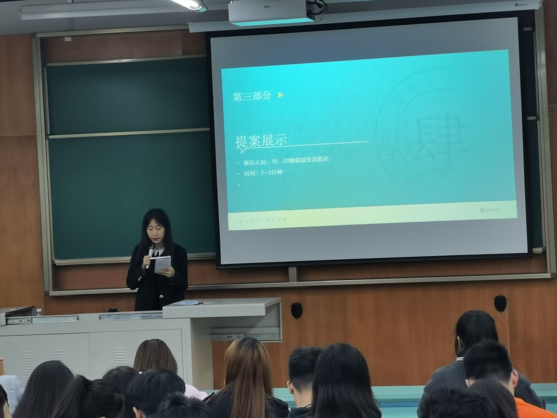 最后,由权益与生活委员们展示了优秀提案,学生会主席霍东峰也就部分提案给出了建议
