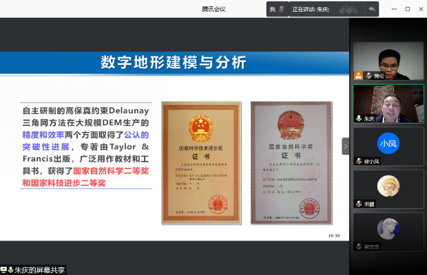 朱庆老师首先介绍了自己从硕士论文开始研究数字地形建模,将铁路DEM发展为空间数据基础设施(SDI),从土木工程到国家空间数据基础设施(NSDI),并讲到高保真度TIN是JX4国产数字摄影测量工作站与国际同类产品竞争的核心优势技术之一,自主研制的高保真的Delaunay三角网方法在大规模DEM生产的精度和效率两方面获得了公认的突破性进展,并获得了国家自然科学二等奖和国家科技进步二等奖。朱老师还曾参与著作了1998年和2018年版《数字高程模型》教材的部分内容。朱老师表示,作为研究生,我们要以持之以恒的毅力对待自己选定的研究方向,要把论文写在祖国大地上,作为中共党员,更应该担负起年轻人应该担负的责任。