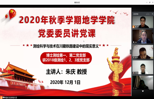党委委员朱庆在腾讯会议(会议ID:722 811 290)为学生党员讲授了《新时代青年的使命与担当》专题党课,本次党课由博士测绘第二党支部书记蒲伦主持,博士测绘第一、第二党支部和研18级测绘1、2、3班党支部全体成员参加。