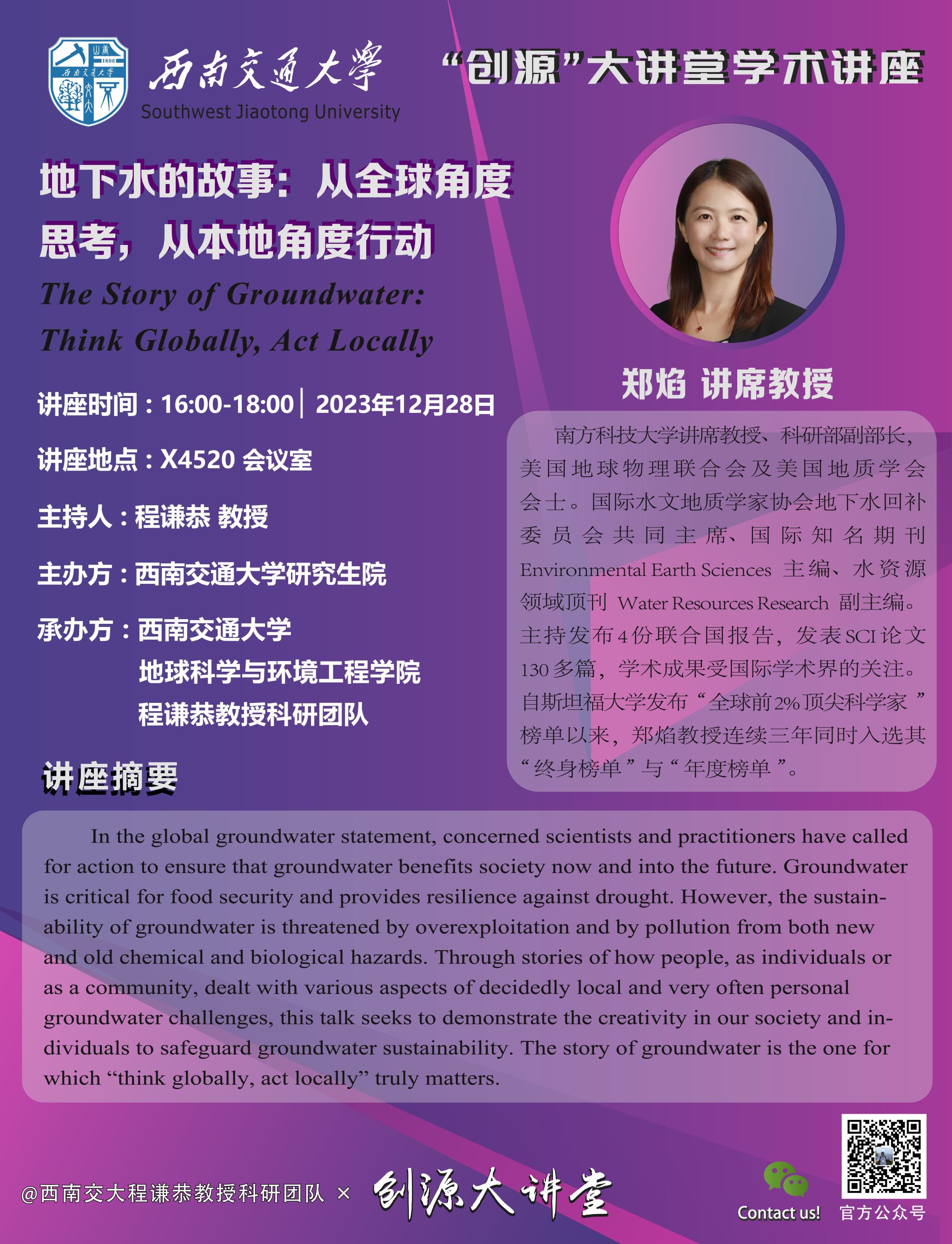 讲座题目:地下水的故事:从全球角度思考,从本地角度行动(The Story of Groundwater: Think Globally, Act Locally)