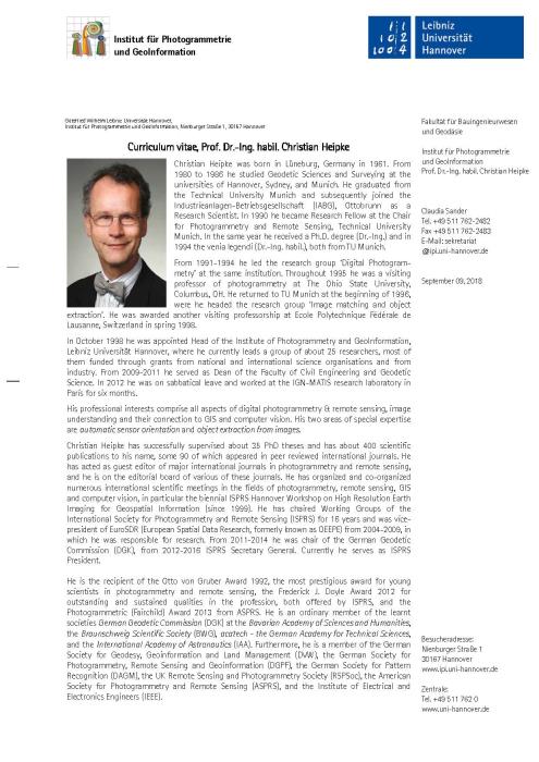 Prof. Dr. Christian Heipke is the recipient of the Otto von Gruber Award 1992, the most prestigious award for young scientists in photogrammetry and remote sensing, the Frederick J. Doyle Award 2012 for outstanding and sustained qualities in the profession, both offered by ISPRS, and the Photogrammetric (Fairchild) Award 2013 from ASPRS. He is an ordinary member of the learnt societies German Geodetic Commission (DGK) at the Bavarian Academy of Sciences and Humanities, the Braunschweig Scientific Society (BWG), acatech - the German Academy for Technical Sciences, and the International Academy of Astronautics (IAA). Furthermore, he is a member of the German Society for Geodesy, Geoinformation and Land Management (DVW), the German Society for Photogrammetry, Remote Sensing and Geoinformation (DGPF), the German Society for Pattern Recognition (DAGM), the UK Remote Sensing and Photogrammetry Society (RSPSoc), the American Society for Photogrammetry and Remote Sensing (ASPRS), and the Institute of Electrical and Electronics Engineers (IEEE).