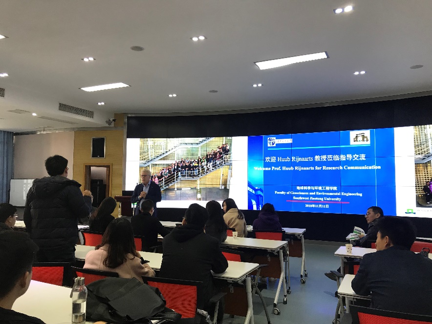 On November 11, 2018, Prof. Huub Rijnaarts, Dean of the Institute of Environment and Climate, Wageningen University, the Netherlands, was invited by Prof. Gong Zhengjun to give academic lectures and academic exchanges at X4243. Associate dean Ouyang Feng, Professor Huang Tao, Professor Gong Zhengjun, Associate Professor Zhang Han, Senior Engineer Wang Dongmei, and some students from environmental engineering and related majors attended the academic lecture. This lecture was hosted by Professor Gong Zhengjun.