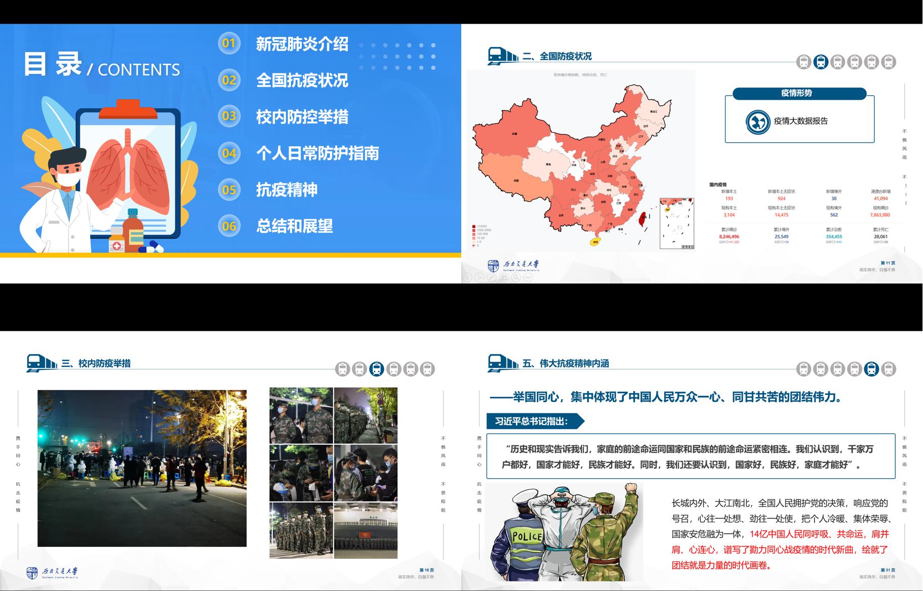 自2020年以来,我们便开启了“同舟共济战‘疫’记”,从国家坚持“动态清零”不动摇到学校积极响应配合,我们每一个人都参与到这场行动中万众一心。在这场殊死较量中,中国人民和中华民族以敢于斗争、敢于胜利的大无畏气概,铸就了生命至上,举国同心,舍生忘死,尊重科学,命运与共的伟大抗疫精神。第十五组学员制作了PPT作品向大家介绍了疫情的发展、全国疫情状况以及个人防护措施等,弘扬了伟大抗疫精神、分享了自己的切身感受,深刻体会到疫情下中国特色社会主义制度的优越性。