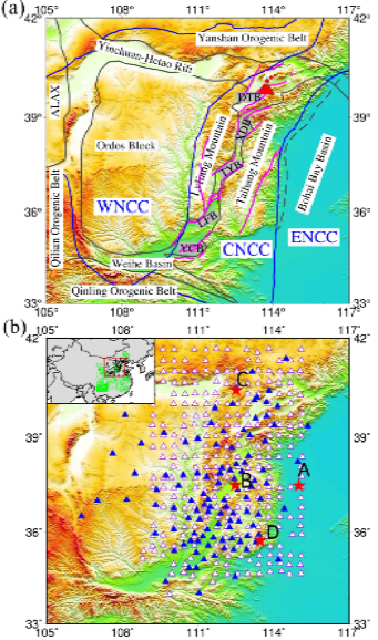 华北克拉通是全球范围内典型的克拉通活化和岩石圈减薄案例,其东部在中生代晚期以来遭受强烈破坏,而中部地区作为稳定的鄂尔多斯地块和活化的东部地块之间的过渡带,经历了复杂的构造演化过程(图1a)。然而,关于中部地区山西断陷带的形成机制以及太行 - 吕梁山脉的隆升过程仍存在诸多争议,制约了对华北克拉通构造演化的深入理解。