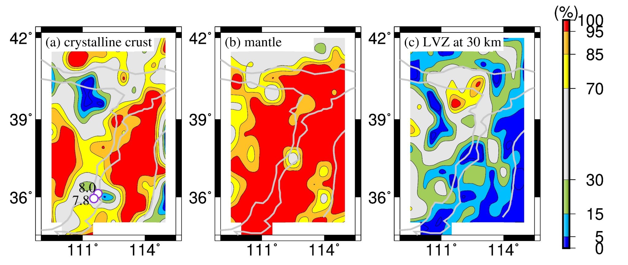 图3.研究区(a)结晶地壳和(b)上地幔的径向各向异性为正的概率分布,(c)30 km深度存在低速层的概率分布.